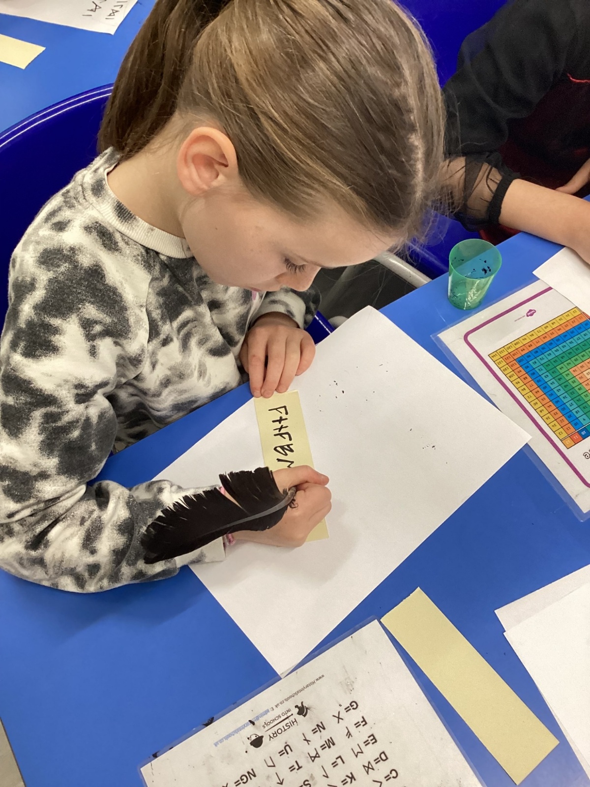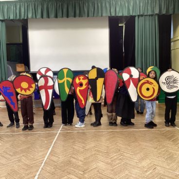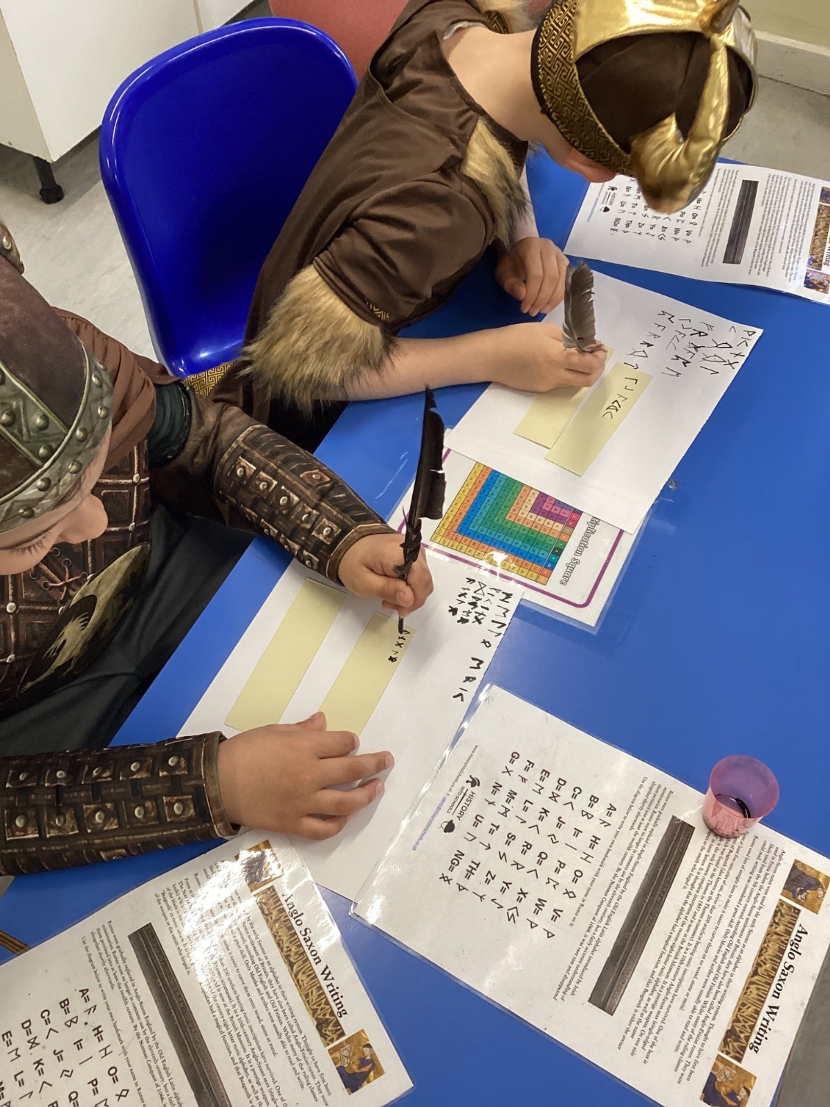 The children were able to hear all about the history of the era and get hands-on experience with artefacts, armour and weapons. They also had the opportunity to write their names in Anglo or Viking runes using a quill and ink and then had the opportunity to use shields and javelins in games.